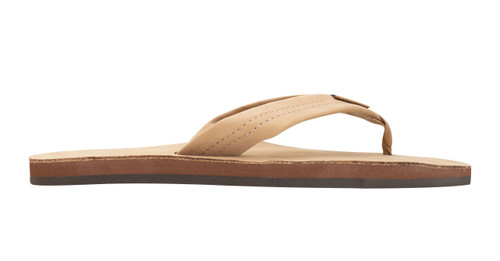 The single layer premier leather sandal is made with top grade nubuck leather; the top sole is embossed with the Rainbow® logo. The strap, also nubuck leather; is double stitched, and the nylon toe piece is secured with a box X stitch, all using bonded nylon thread.