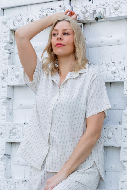 Classic shape cotton blouse, in ivory with a decorative stitch stripe woven into it, which looks adorable worn as a matching set with the Naples Pants. The fabric is soft pure cotton which is ideal to wear in the heat. You will love the shell buttons and the loose comfortable fit.
